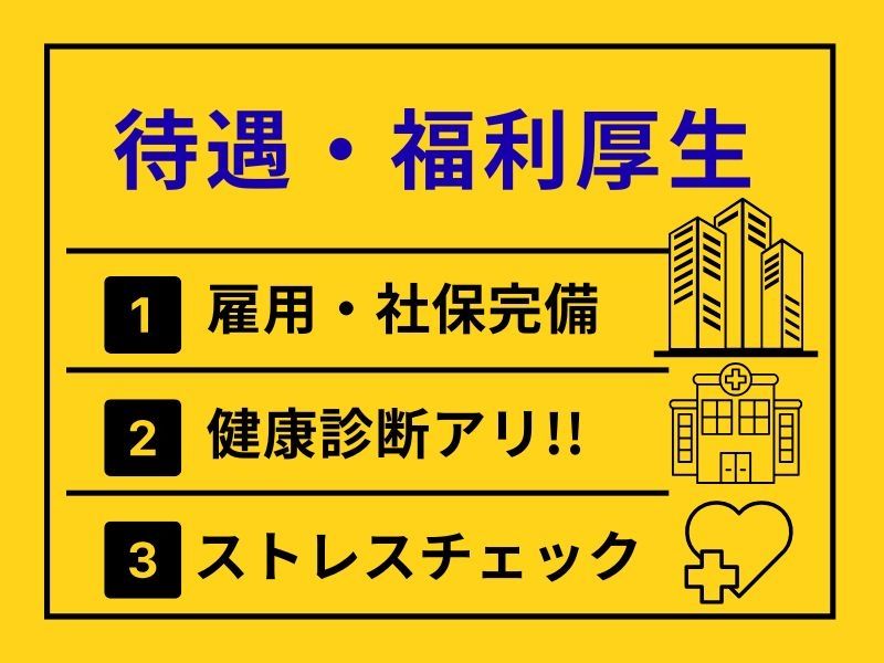 待遇・福利厚生 | 【保険制度】 雇用保険、労災保険、健康保険、厚生年金 【福利厚生】 福利厚生・加入保険 【待遇・福利厚生】 ▼給与即払い・日払い・週払い(規定有) ▼社会保険完備(労働時間など一定の条件を満たす場合) ▼健康診断・ストレスチェック(年1回) ▼扶養範囲内勤務の相談OK ▼有給休暇制度(勤務6ヶ月後) ▼相談窓口(就業中のスタッフの皆さんをサポート) ▼産休(産前・産後休暇)育休(育児休暇) 【加入保険】 社会保険完備 |